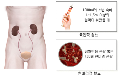 혈뇨는 소변에 피가 섞여 나온다는 뜻입니다. 소변에 혈뇨가 있는 경우 혈뇨의 양이 많은 경우 육안으로도 붉게 보일 수 있지만(육안적 혈뇨), 혈뇨의 양이 작은 경우에는 현미경으로 소변을 관찰해야만 발견되기도 합니다(현미경적 혈뇨). 현미경적 혈뇨는 대개 현미경으로 검사했을 때 고배율 (400배) 시야에서 일반적으로 3개 이상의 적혈구가 관찰될 때로 정의합니다.