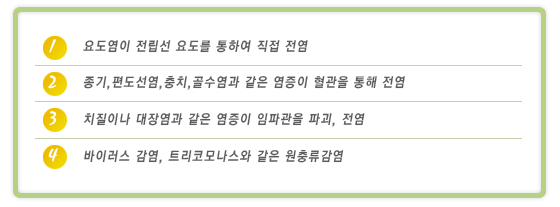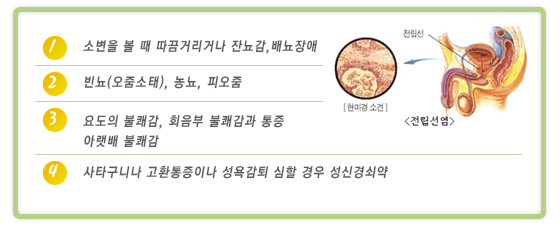 | 전립선질환은 크게 3가지로 대별할 수 있는데, 세균감염이나 소변의 역류에 의해 염증이 생기는 전립선염과 호르몬의 영향과 나이가 들면서 점차 조직이 증식되어 요도를 압박하여 소변보기가 어려워지는 전립선비대증, 그리고 전립선내의 암세포에 의해 생기는 전립선암으로 구분할 수 있다. 한국인의 전립선질환은 서양인에 비해 전립선염이 많은 것이 특징이고, 전립선암의 빈도는 매우 낮으며, 노인인구의 증가로 전립선비대의 빈도는 점차 증가하고 있다. |